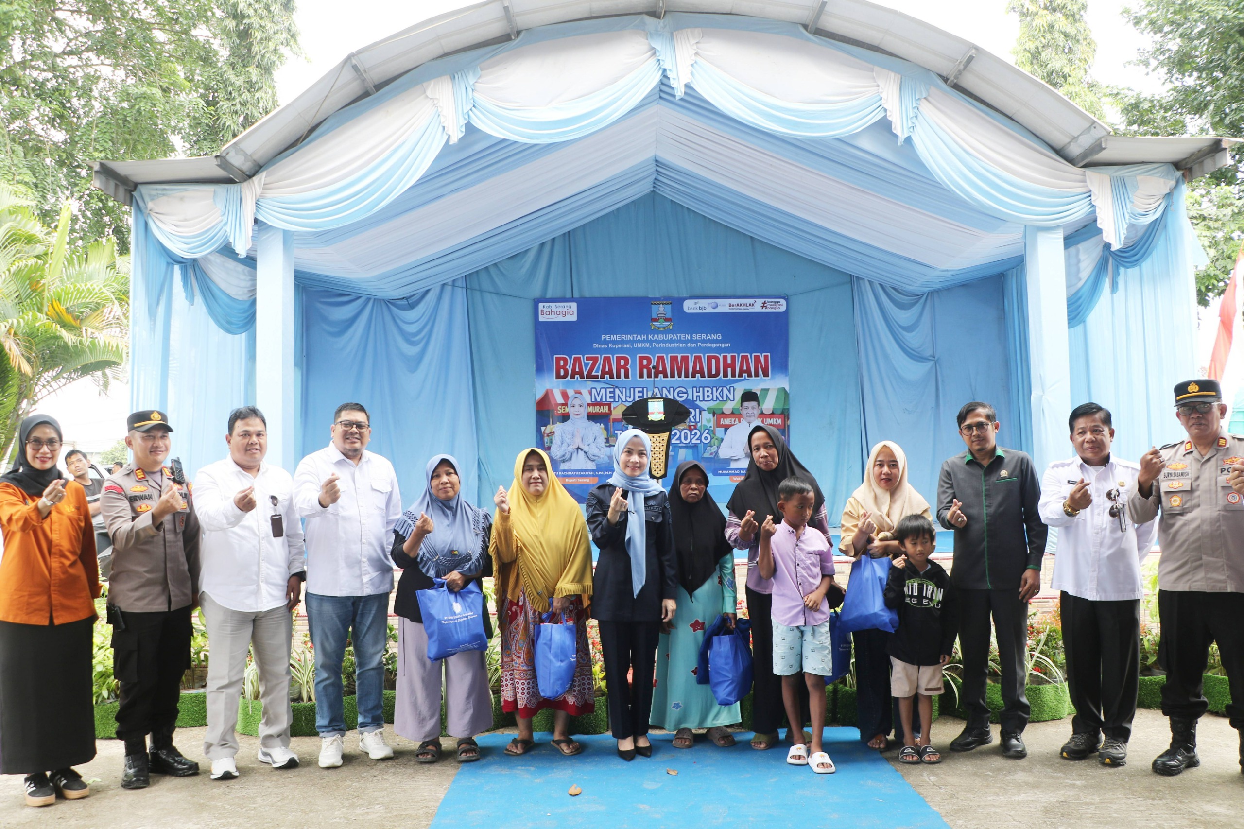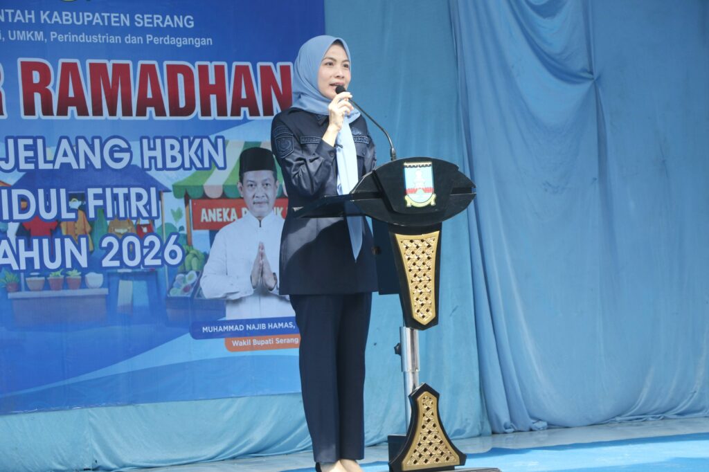 Bupati Serang Ratu Rachmatuzakiyah membuka Bazar Murah Ramadhan Bahagia yang digelar Dinas Koperasi UMKM Perindustrian dan Perdagangan (Dikoumperindag) di Halaman Kantor Kecamatan Jawilan pada Rabu, 25 Februari 2026.