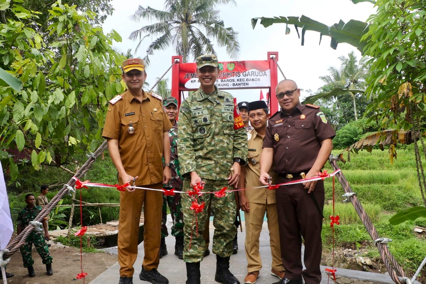 Komandan Komando Distrik Militer (Dandim) 0602/Serang, Kolonel Artileri Medan (Arm) Oke Kristiyanto, Sekretaris Daerah (Sekda) Kabupaten Serang, Zaldi Dhuhana dan Kepala Kejaksaan Negeri (Kajari) Serang IG. Punia Atmaja NR meresmikan Jembatan Garuda di Kampung Mayak, Desa Baros, Kecamatan Baros  pada Senin, 9 Maret 2026.