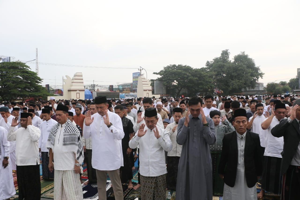 Wakil Bupati Serang Muhammad Najib Hamas melaksanakan sholat Idul Fitri 1447 Hijriyah di Alun-alun Kecamatan Kramatwatu pada Sabtu, 21 Maret 2026. Mengenakan baju Koko biru, Najib Hamas didampingi sang istri Tifa Hensifa Hanum Najib.
